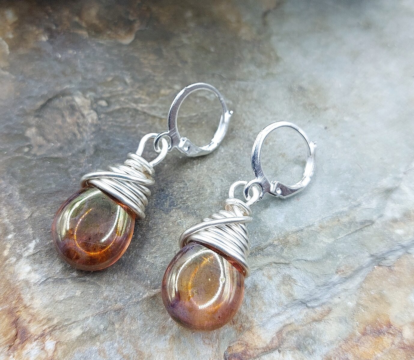 Beautiful elegant drop earrings made with 10mm glass teardrop beads, wire wrapped with 22 gauge non tarnish silver wire. Total length 1.25″