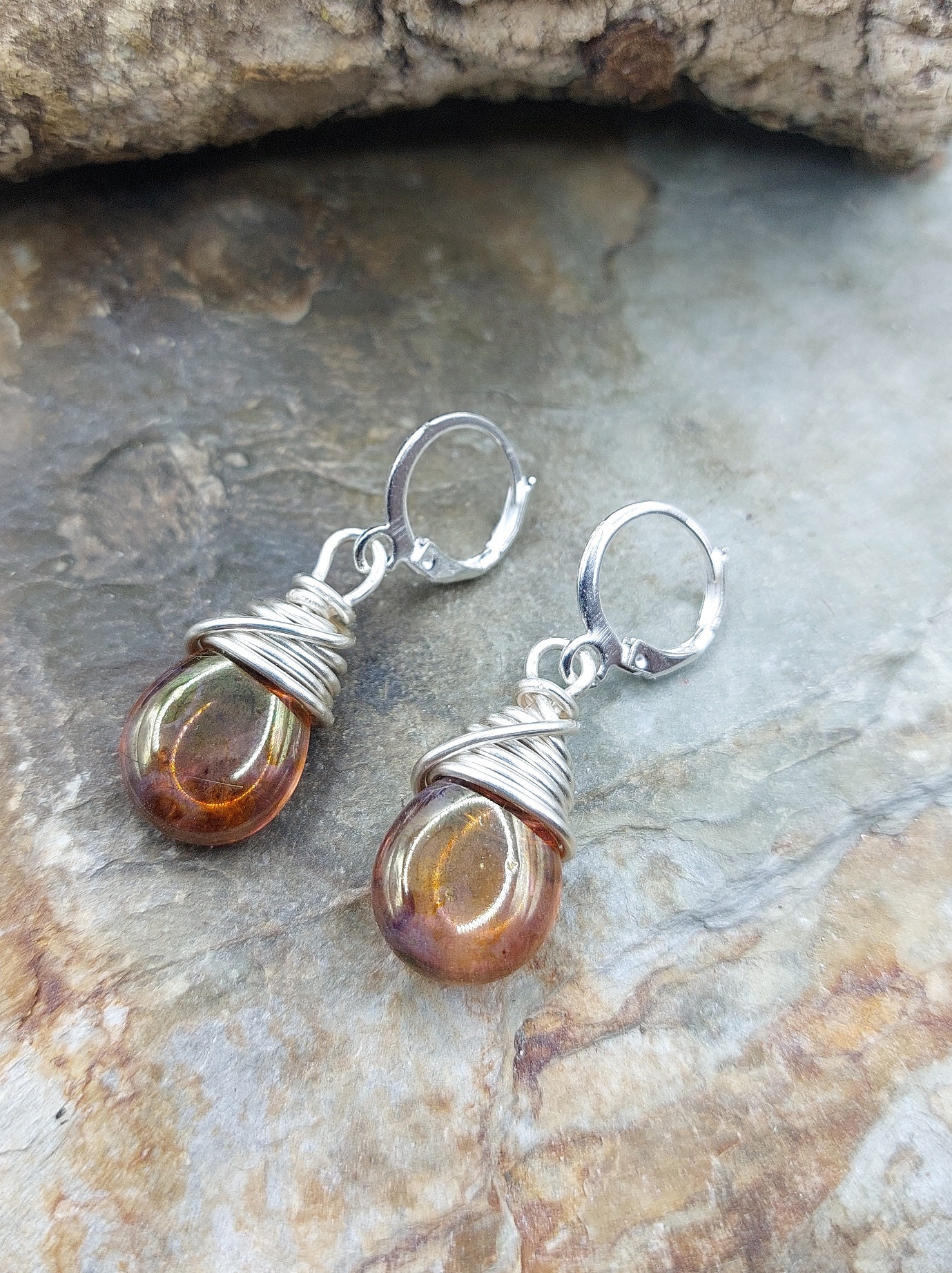 Beautiful elegant drop earrings made with 10mm glass teardrop beads, wire wrapped with 22 gauge non tarnish silver wire. Total length 1.25″
