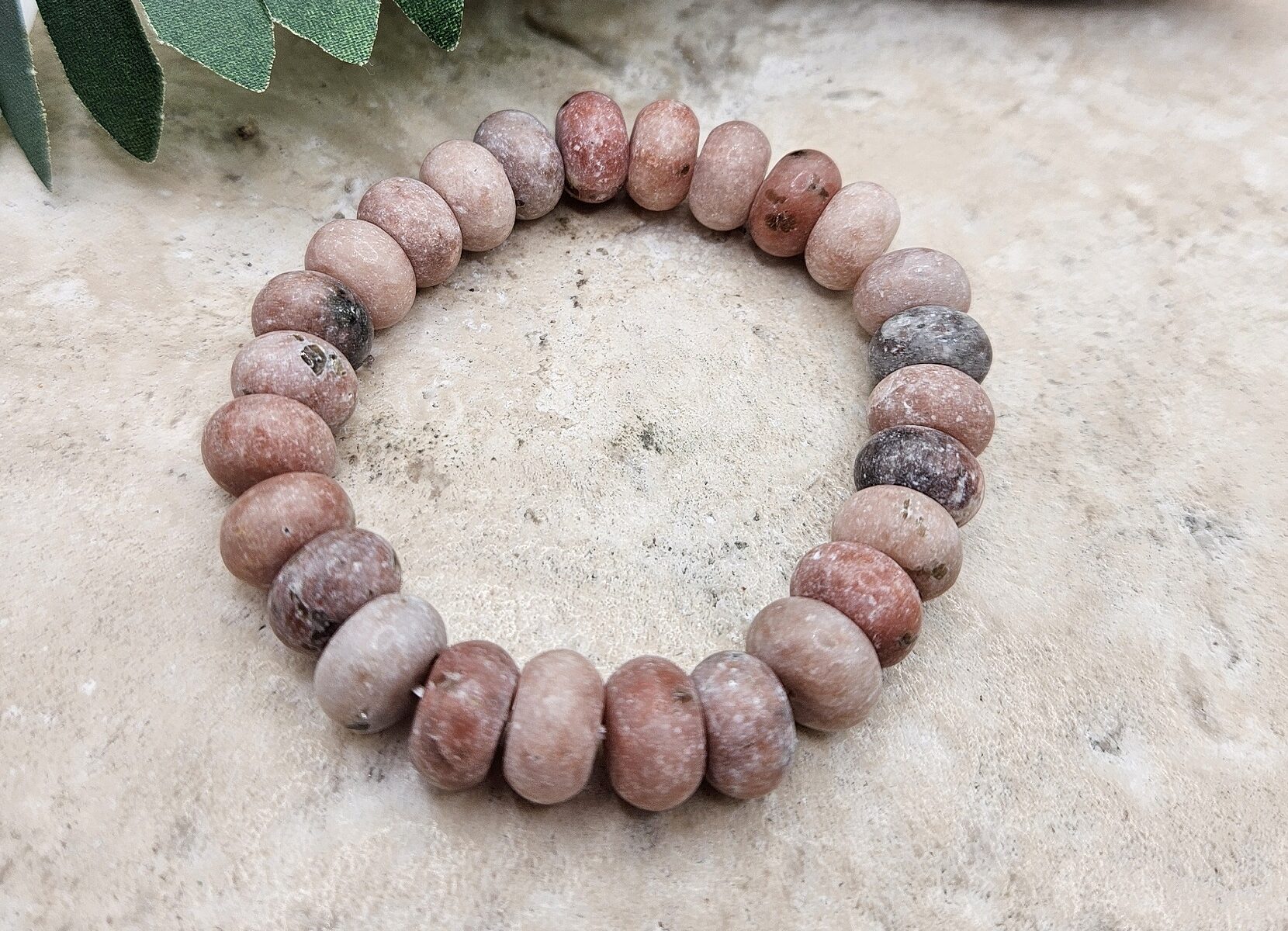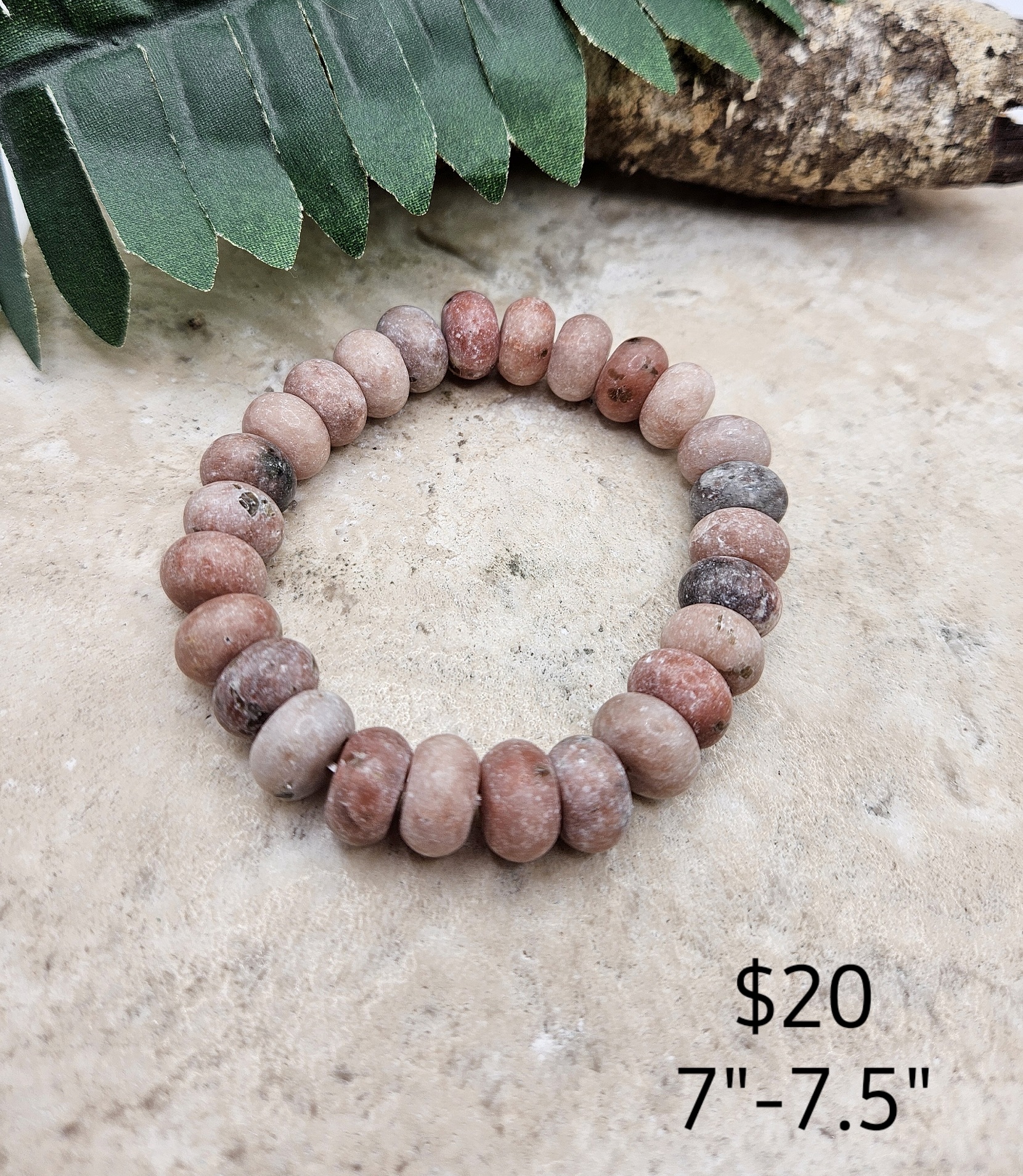 Handmade Pink Rhodonite stone stretch bracelet accented with 8mm rondell Rhodonite stones. Double threaded for durability. Fits 7″-7.5″ wrist