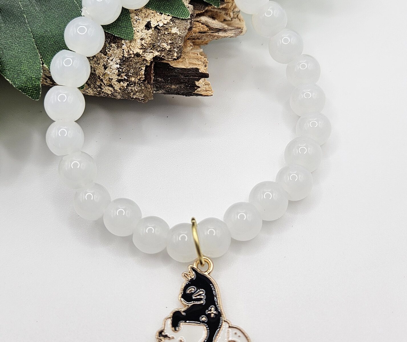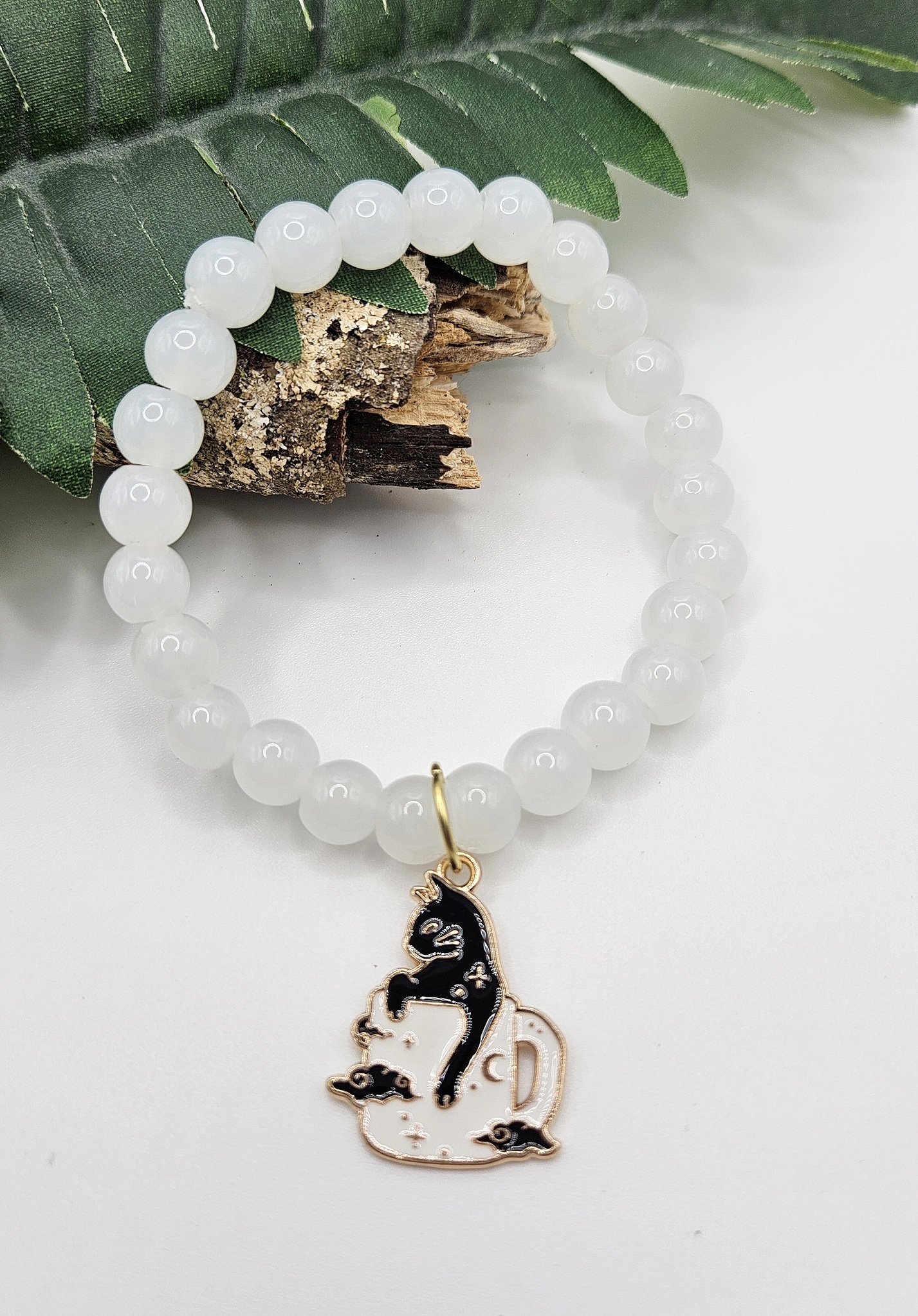 Handmade cat charm stretch bracelet accented with 8mm glass beads. Double threaded for durability. Fits 7″-7 5″ wrist